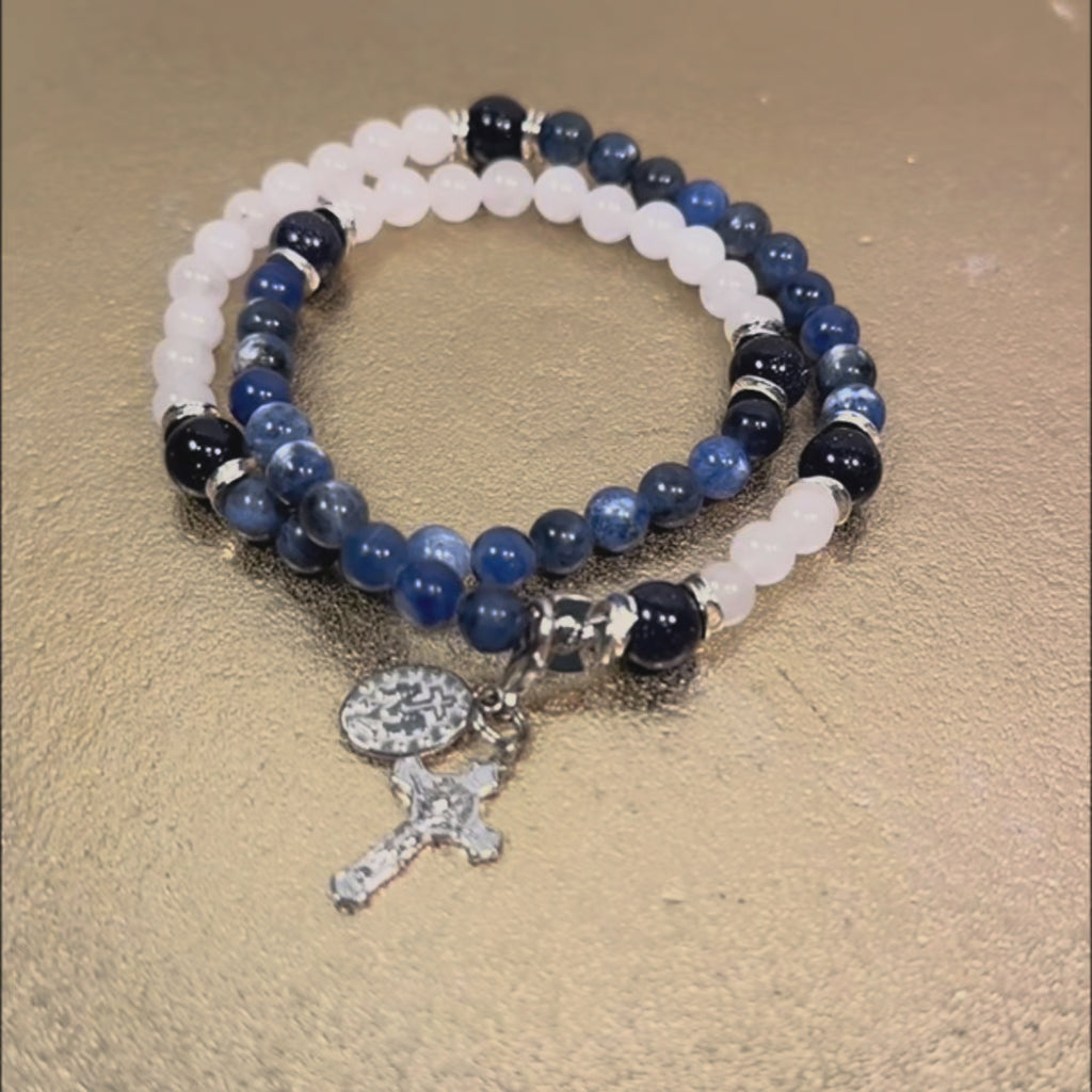 The Calcutta Rosary Bracelet embodies the purity of heart and steadfast faith that marked the life of Saint Teresa of Calcutta. With hues of blue and white , colors she wore daily in her mission to serve the poorest of the poor . This bracelet invites you to carry that same love and light into your own season of giving.