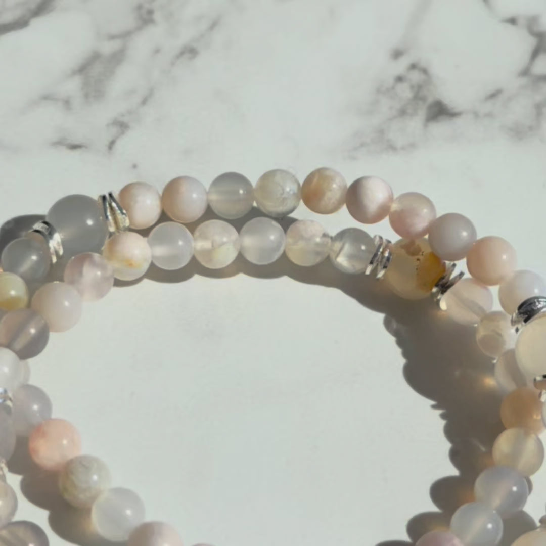 ⨠Chews Life Gemstone Rosary Bracelet A stunning wearable rosary crafted with cherry blossom Ave and Pater beads and delicate silver accents. Beautiful enough to wear every day, meaningful enough to treasure forever.