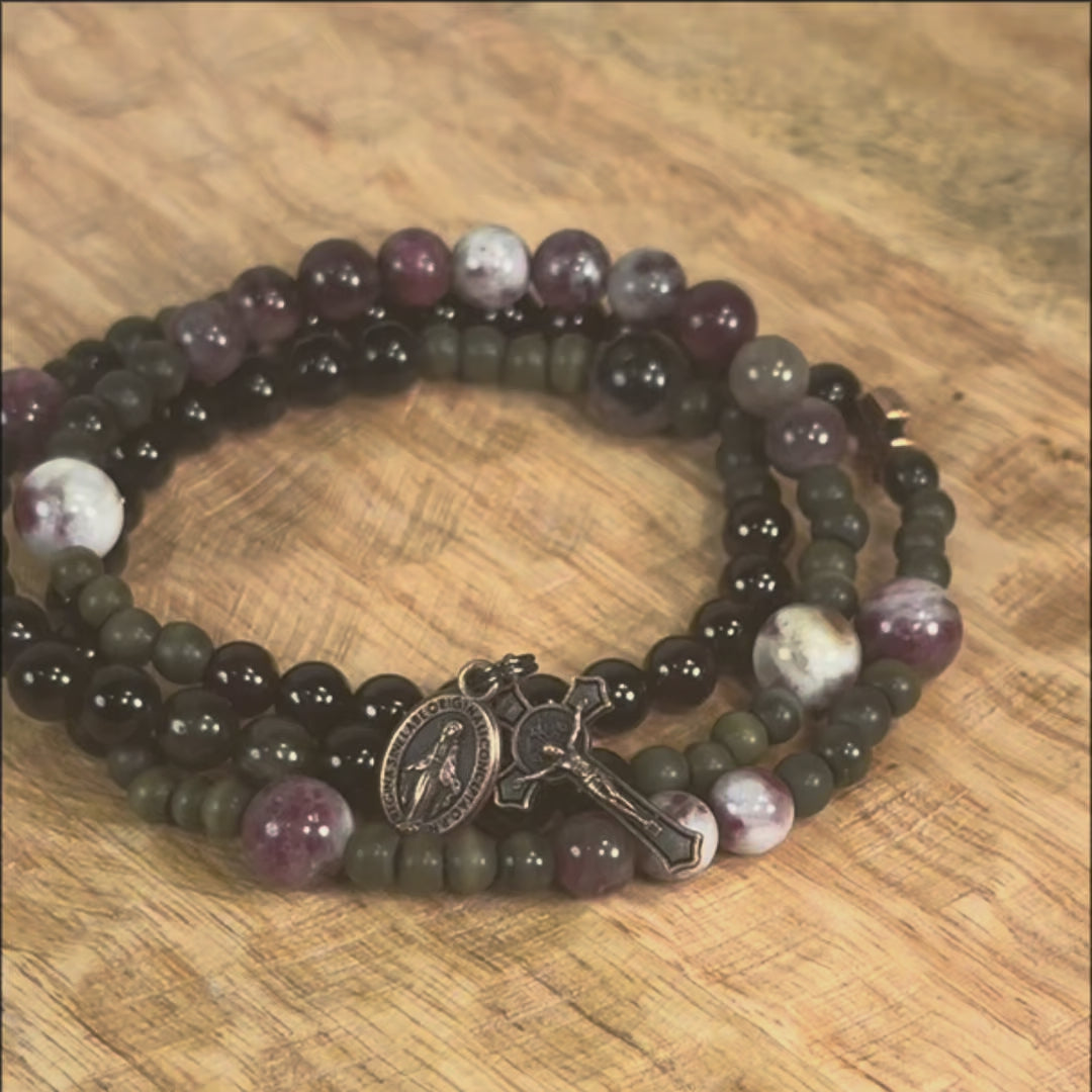 Rich plum tourmaline and deep red garnet Ave beads reflect the depth and gravity of Lent, repentance, sacrifice, and quiet hope. Green glass spacer beads add gentle contrast and rhythm, while plum tourmaline Pater beads mark each Our Father, grounding the prayers in intention and pause.