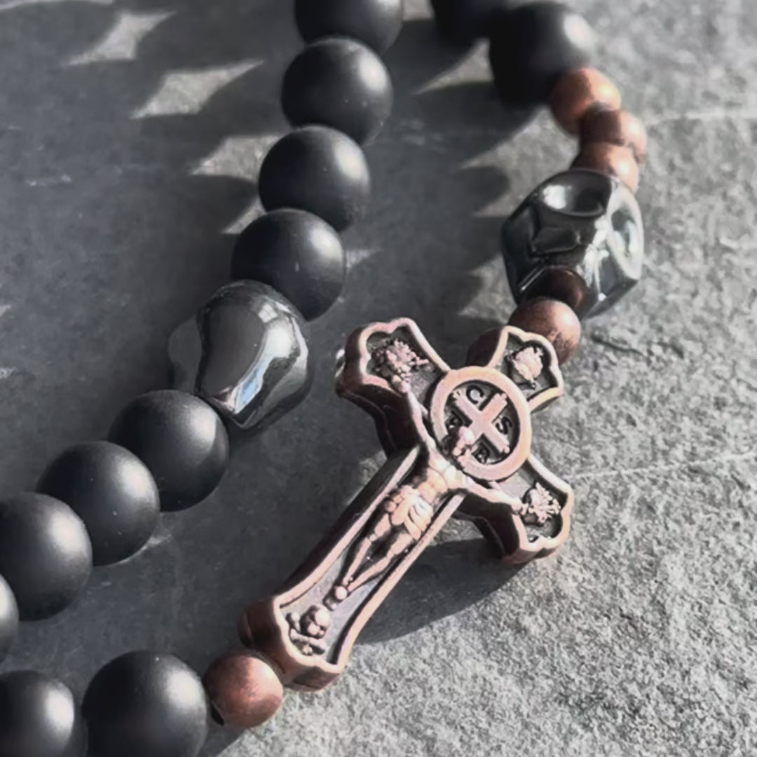This isn’t just a bracelet—it’s a battle reminder. The Memento Mori Rosary Bracelet pairs black matte onyx Aves with bold skull Paters, anchored by the exclusive Crux Invicta Crucifix. Worn on the wrist, it’s both a full weapon of prayer and a striking statement of faith.