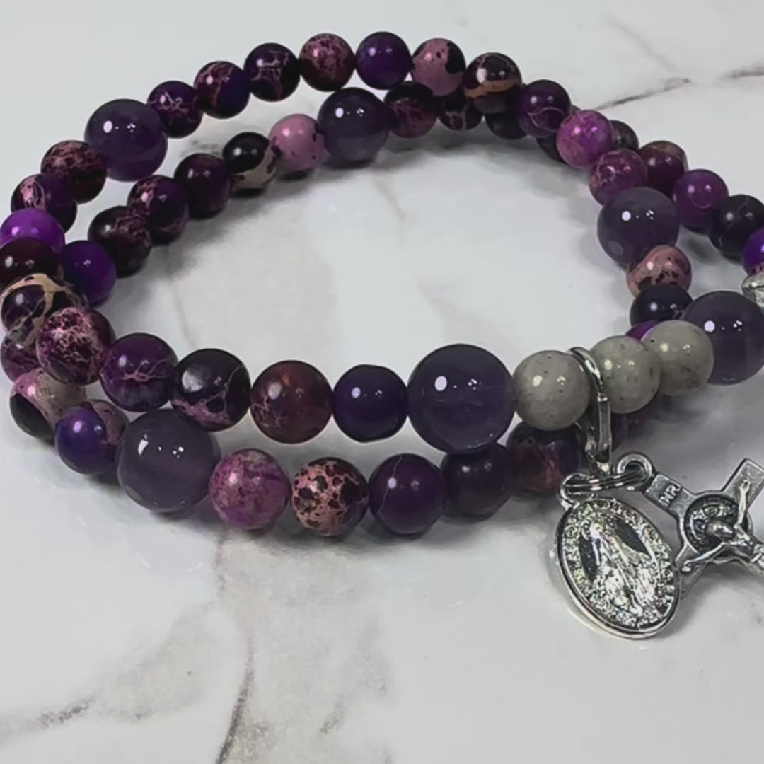 This beautiful gemstone rosary bracelet features Amethyst beads as the paters and purple aquaterra beads as the aves. Each of our stretch and wrap rosary bracelets is a full rosary.