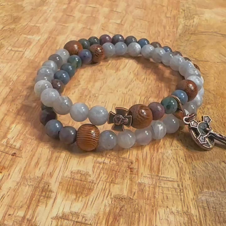 Inspired by Saint Pier Giorgio Frassati, this rosary bracelet combines strength, simplicity, and beauty in a timeless design. Handcrafted with fancy jasper and gray moonstone Aves, accented by a dark wooden Pater bead, this piece reflects the earthy humility and joyful spirit of the saint known for his mountaintop adventures and deep devotion to prayer.