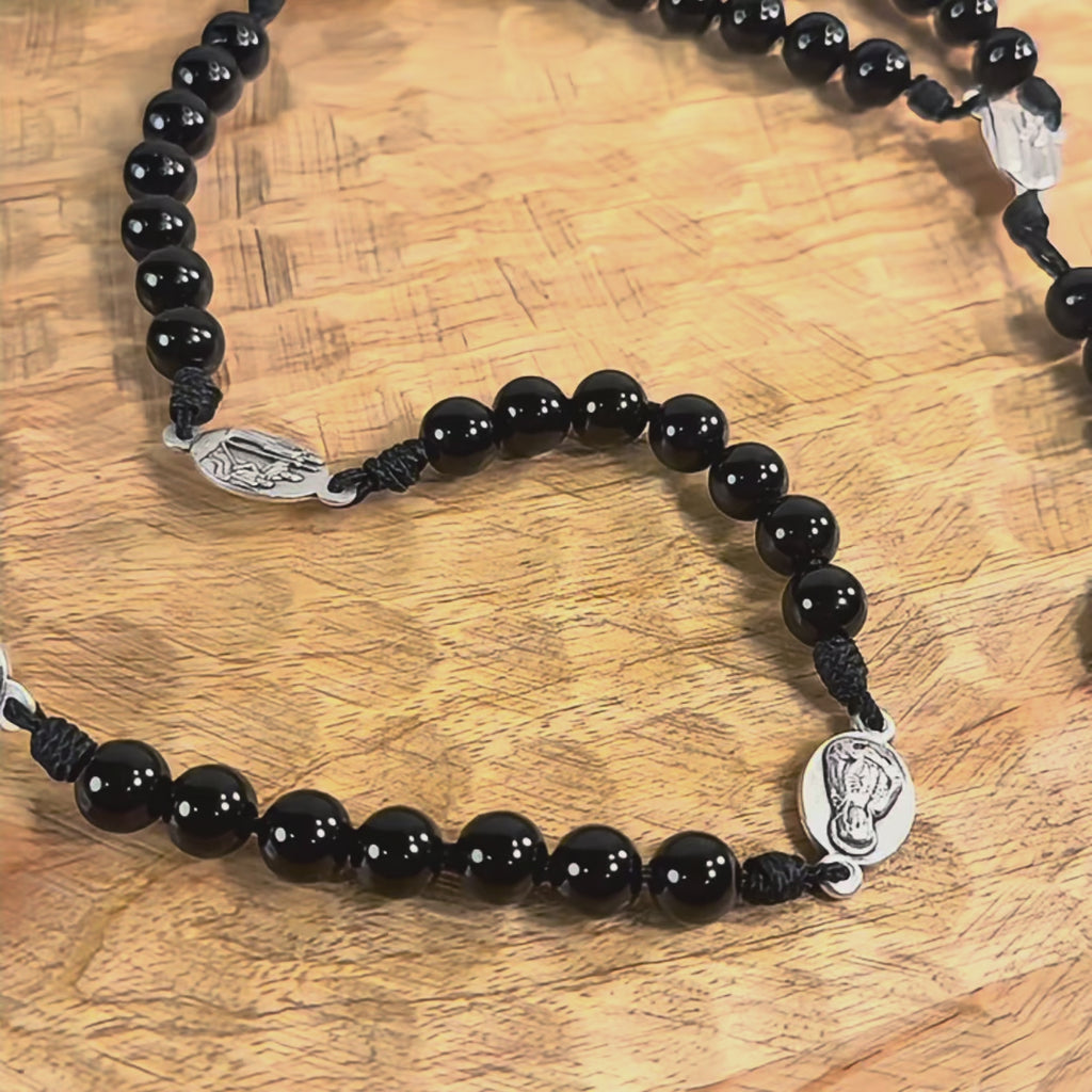 This beautiful full size Seven Sorrows Gemstone Rosary is strung on a durable and flexible paracord. The Ave beads are Glossy Black Onyx Agate. This rosary also features a beautiful image of our Sorrowful Mother on each of the medals along with images that show the seven different Sorrows of Mary. Not only is this rosary stunning, but it is sure to last!