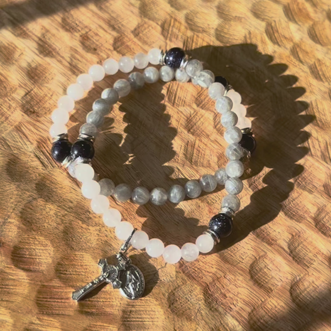 Inspired by the prayerful rhythm of the St. Andrew Christmas Novena, the St. Andrew Double Wrap Bracelet features soothing tones of gray moonstone accented by silver wavy spacers and deep blue Blue Goldstone paters, that twinkle like the night sky. Designed to wrap twice around the wrist, this bracelet beautifully combines devotion and timeless style.