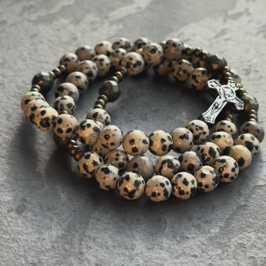 This Rosary bracelet was designed using dalmation Jasper for the ave’s and pyrite paters and features our very own Crux Invicta Crucifix.