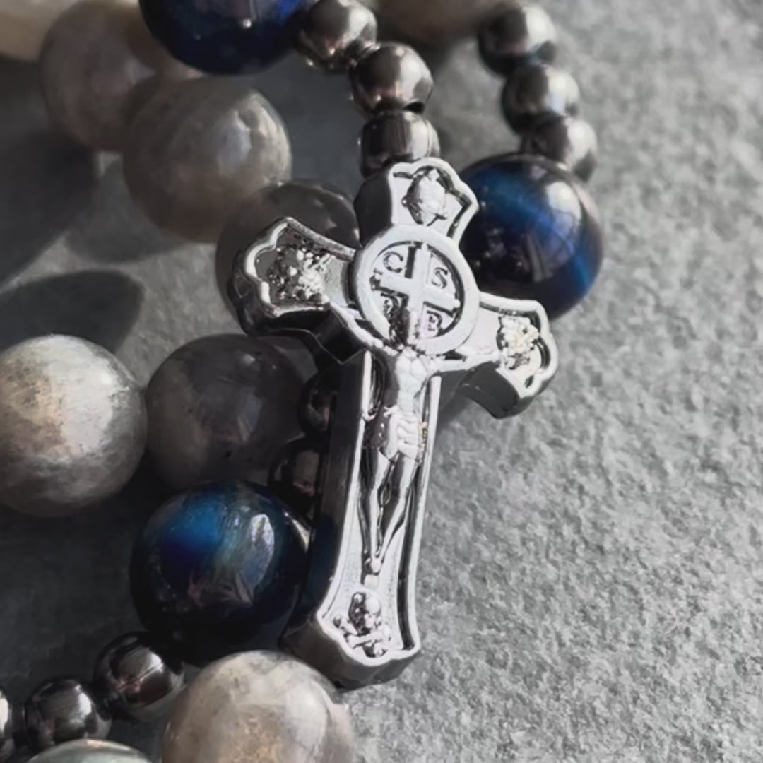 This Rosary bracelet was designed using a blue Tigers Eye pater beads, Gray Labradorite aves, and features our very own Crux Invicta Crucifix.