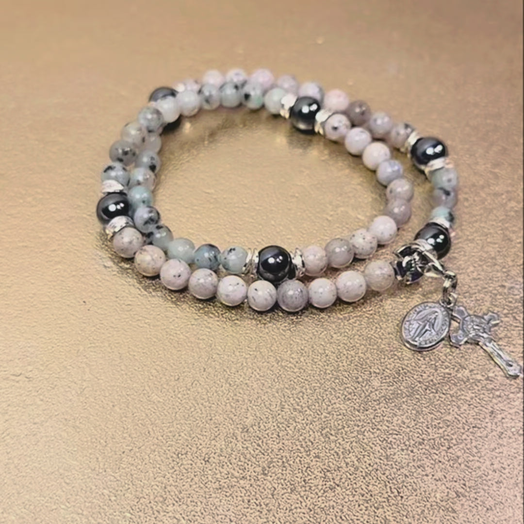 This elevated holiday design features a serene blend of gray feldspar and kiwi sesame jasper aves,. The hematite paters, framed by silver wavy spacers, add a reflective, metallic brilliance, a subtle reminder of grace refined through perseverance. Together, these natural stones create a timeless balance, beautifully suited for the Advent and Christmas seasons.